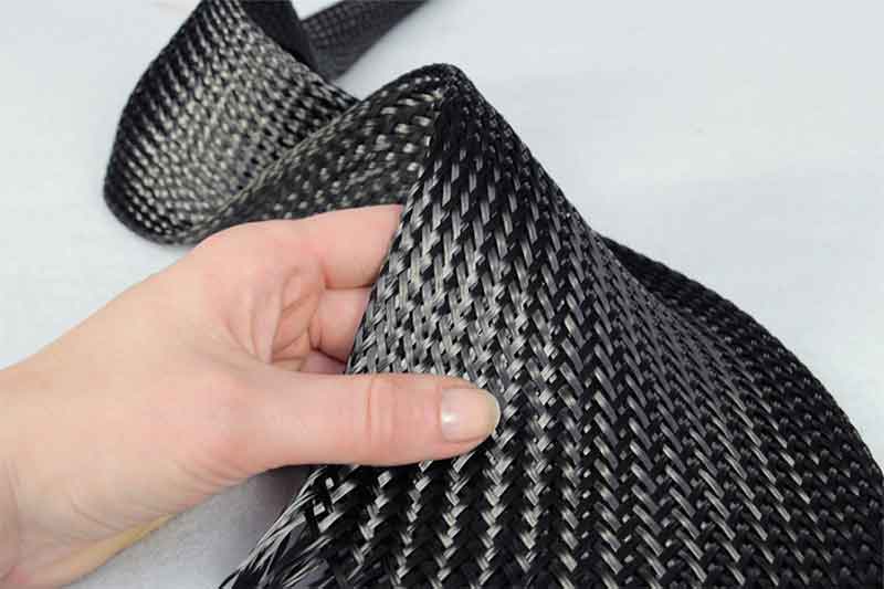 Carbon fibre braided sleeve made from continuously woven biaxial carbon fibre. This very light-weight, 10mm nominal diameter braid is woven from 3k T300 fibre in a 2/2 twill weave pattern and is suitable for a range of applications including making tubing and reinforcing tubes, rods and poles.